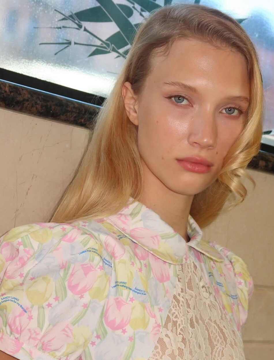O conceito veio da própria Sandy, uma das queridinhas do cenário fashion do Lower East Side, conhecida por seus laços oversized, estampas lúdicas e uma estética que mistura nostalgia com irreverência. Nos bastidores do desfile, quem assinou a beleza foi Charlie Riddle, diretor global de arte da Stila. Para realizar a idealização de Sandy, ele optou por construir uma pele leve, sem base, apenas com correção suave usando o Stila One Step Correct, blushes cremosos com acabamento translúcido e um toque de gloss nos lábios. Tudo para valorizar a beleza natural, com ar saudável, mas sem excessos.