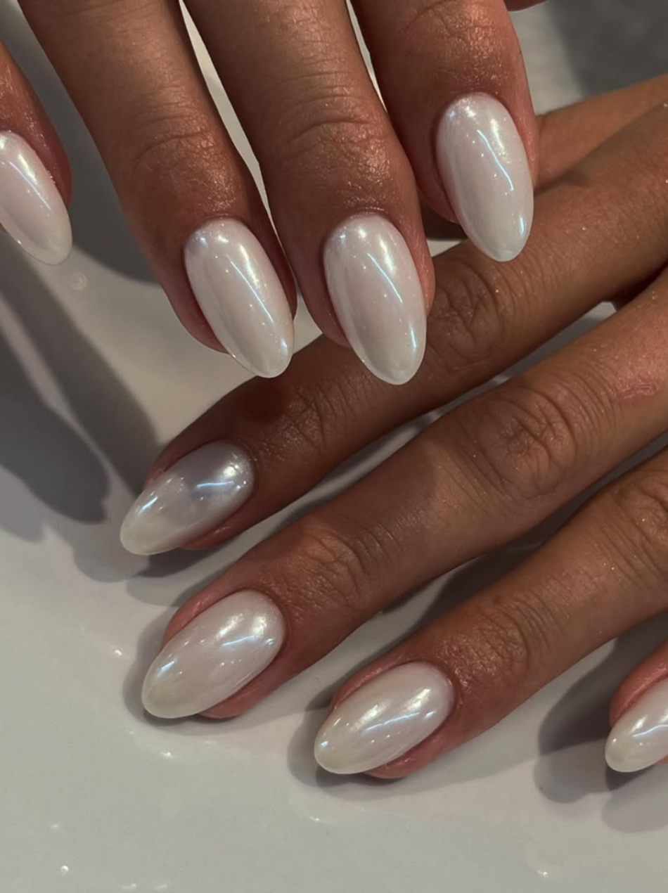 A proposta é simples: sair do branco cremoso tradicional e apostar em um acabamento luminoso, com reflexos perolados que mudam discretamente conforme a luz. O resultado é unhas sofisticadas, com aparência polida e contemporânea, capazes de transitar facilmente entre diferentes estilos, do look casual ao visual mais elegante.