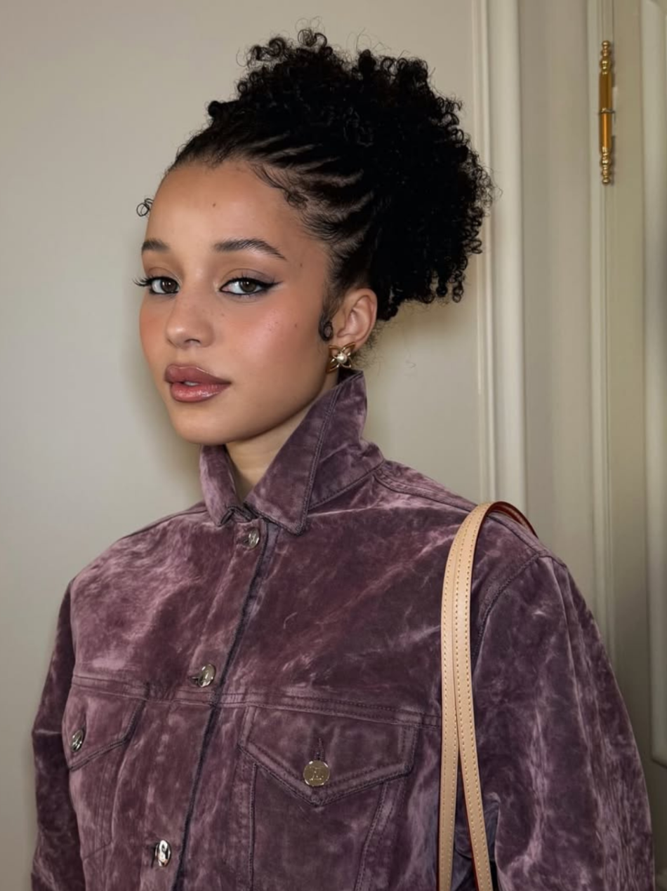 Minimalista e versátil, o coque baixo funciona em praticamente qualquer situação. Basta reunir os fios na altura da nuca e prender de forma levemente desestruturada, permitindo que alguns cachos escapem naturalmente. O charme está justamente nesse equilíbrio entre o arrumado e o casual. É uma opção prática para o dia a dia, mas que também pode ser adaptada com acessórios ou finalização mais definida.