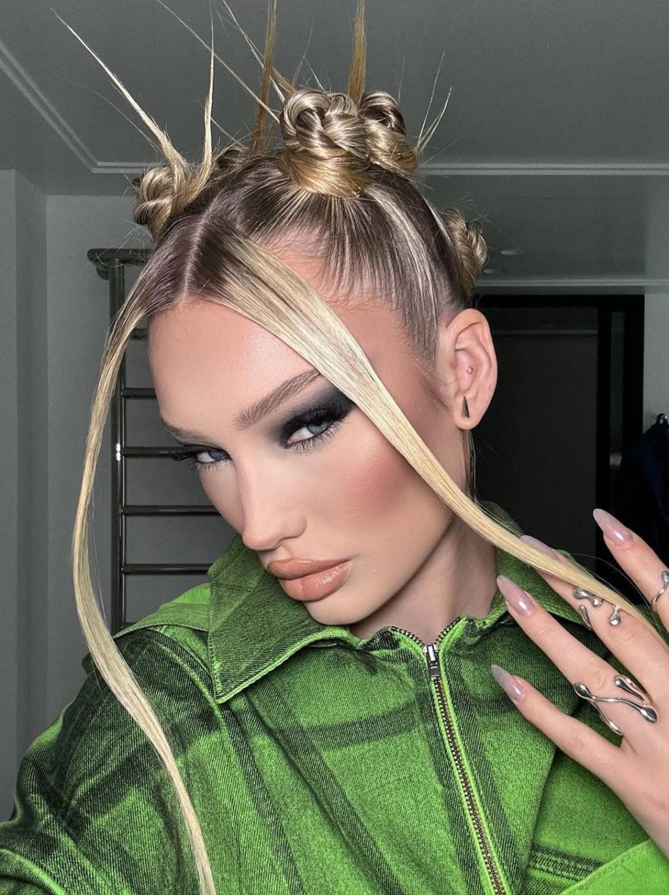 Com estética Y2K e mood irreverente, o spiky bun é a escolha ideal para quem quer um visual impactante sem abrir mão da praticidade. O coque alto ganha pontas propositalmente espetadas, criando um efeito dramático que combina com maquiagem vibrante e produções maximalistas.