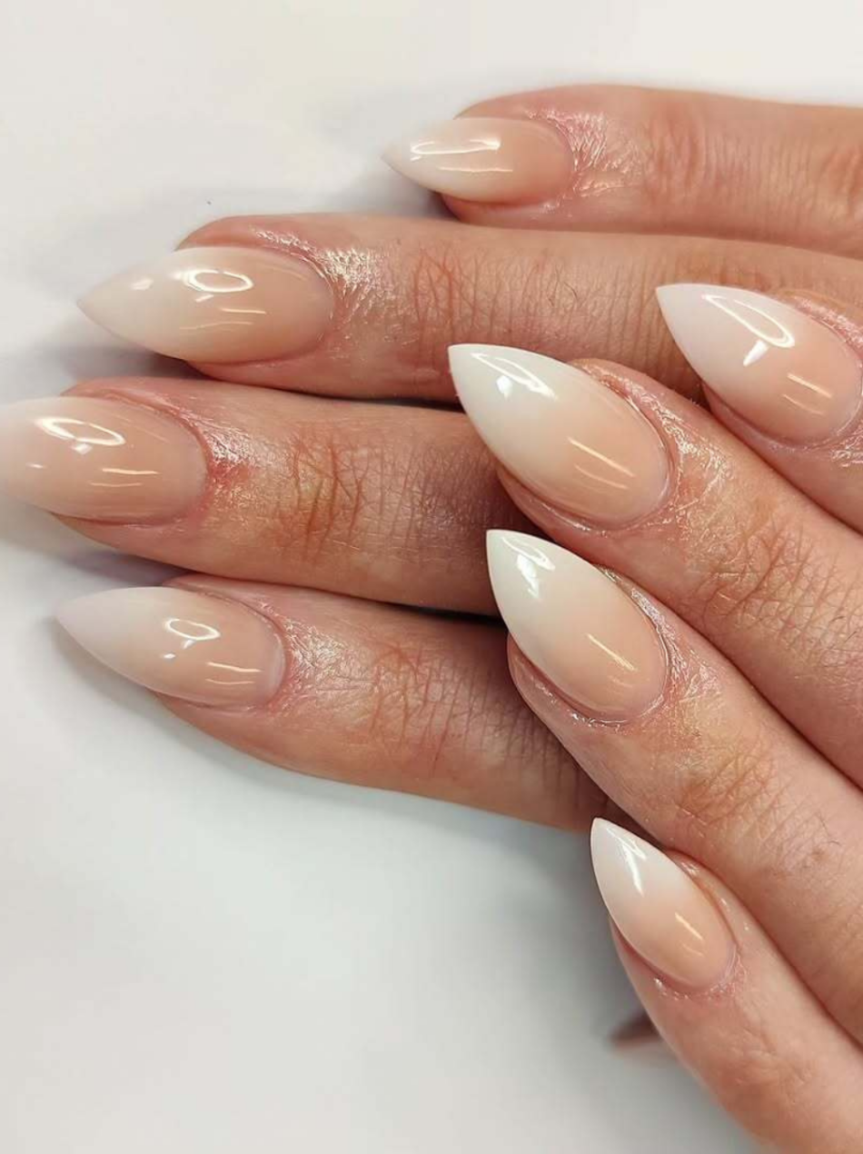 O efeito degradê, também conhecido como ombré nails, se adapta perfeitamente à unha stiletto curta. A transição suave entre cores cria profundidade e movimento, valorizando o formato mesmo em comprimentos reduzidos. Tons neutros oferecem um visual discreto e chique, enquanto combinações mais ousadas reforçam a proposta fashionista da tendência.