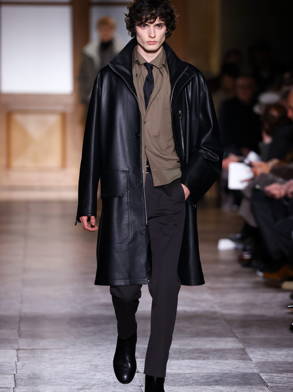 A alfaiataria é precisa. Além da beleza e da boa execução, outros elementos afastam o essencial do ordinário. Há paletós risca de giz com silhuetas levemente ajustadas ao corpo, remetendo aos modelos slim populares nos anos 2010. Outros costumes mais amplos trazem um groove do final dos anos 1970 que dialoga com as bolsas de mão em formato de rádio retrô de fita cassete. O couro, claro, é um material-chave. Aparece em detalhes nas lapelas de blazers e por completo em camisas e calças. O resultado é um toque sexy a este homem de elegância discreta.