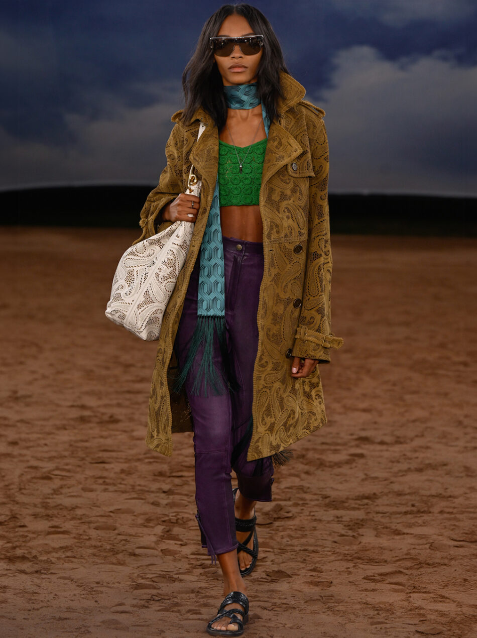 A primeira modelo aparece com um trench coat verde e amarelo de acabamento encerado, botas de cano médio e uma bolsa de camurça na mão. Daí em diante, os looks ecoam o visual de movimentos da contracultura dos anos 1960 e 70, como os hippies, os mod e até os metaleiros-raíz. Claro, a vontade é puxar para hoje os valores que esses grupos carregavam no passado, como liberdade, autenticidade e inquietação.