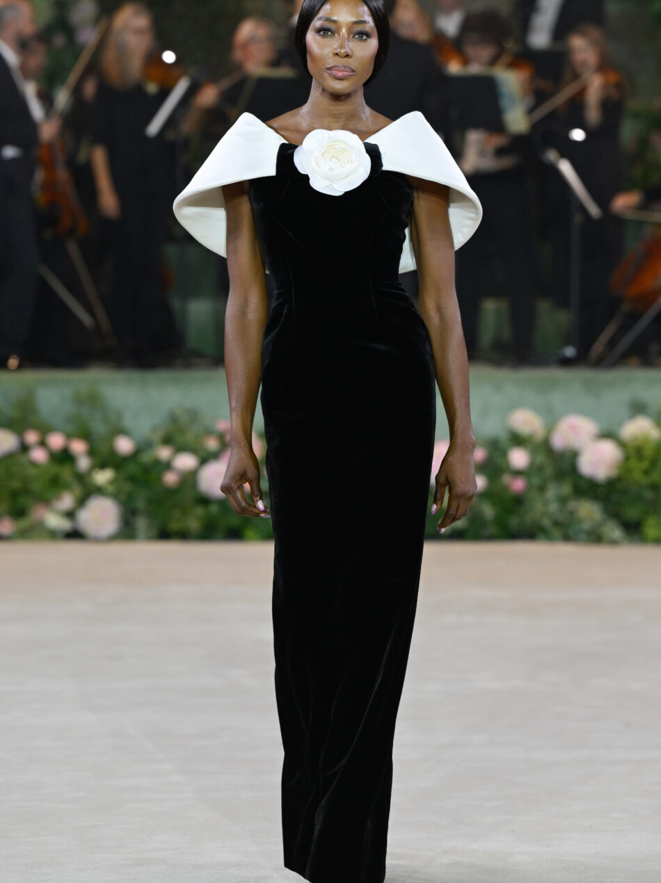 Os desfiles de Richard Quinn são um dos mais aguardados da semana de moda de Londres. Na apresentação de verão 2026, valeu a pena esperar o atraso de uma hora. Ele foi recompensado por Naomi Campbell abrindo a apresentação, ao som de uma orquestra ao vivo, com um vestido de veludo longo e decotado, com uma camélia posicionada sobre o colo.