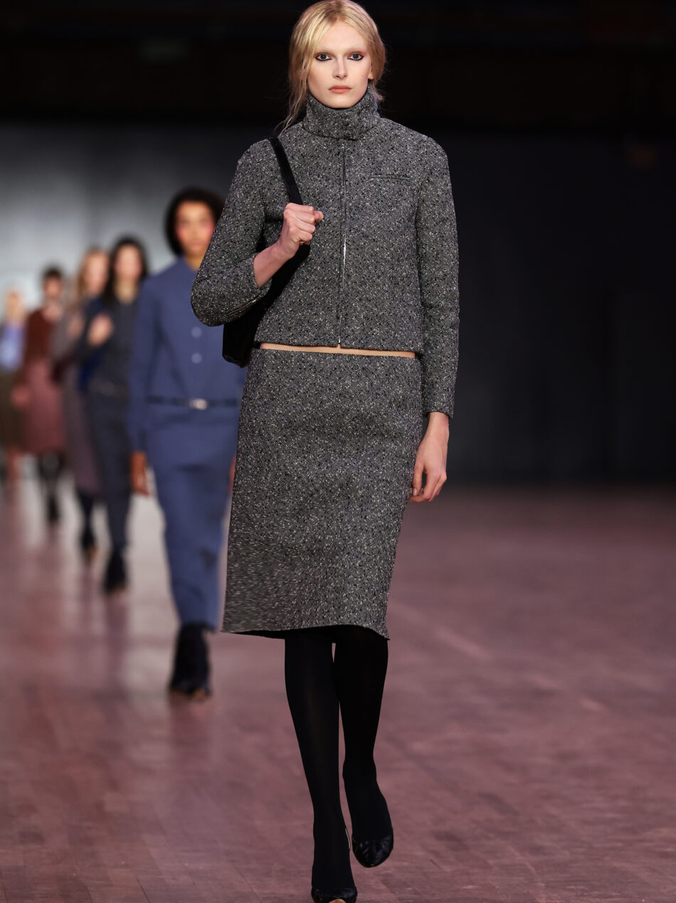 A silhueta agora é contida e linear. As formas ainda se destacam do corpo, como se flutuassem sobre ele, porém de maneira menos dramática, mais discreta. Os suéteres têm os ombros levemente marcados. Os cós das saias têm estruturas geométricas, afastadas do quadril e da cintura – algumas modelos caminham com as mãos enfiadas sob eles, como se fossem bolsos.