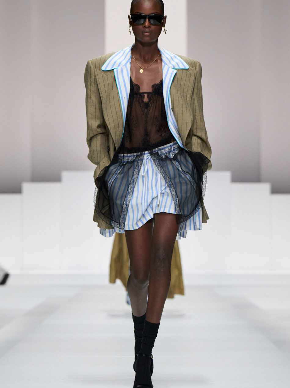 Na passarela da Dolce & Gabbana, o pijama retorna como peça central, atualizado com transparências e rendas que deixam a pele em evidência.