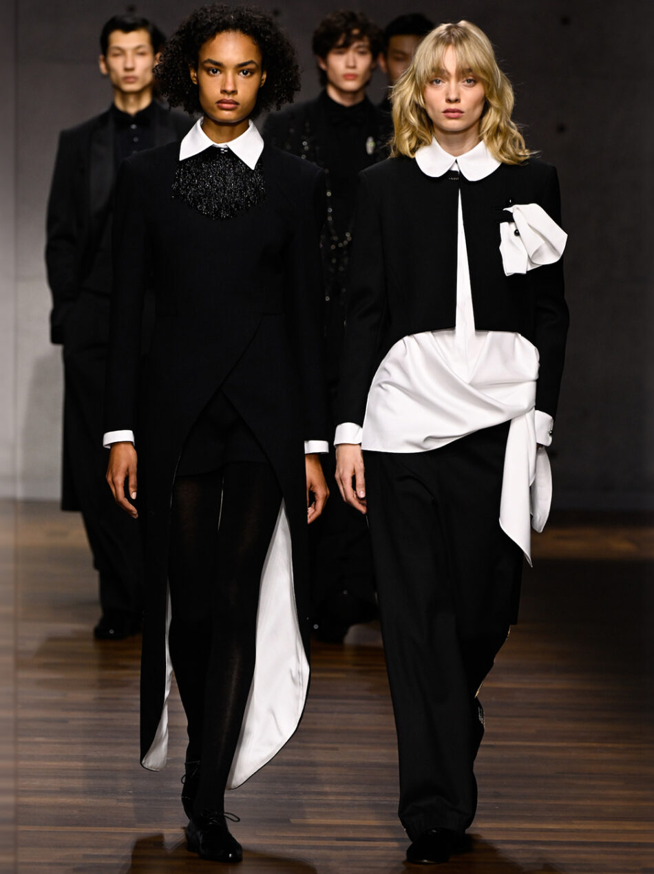Masculino e feminino compartilham o mesmo espaço e os mesmos códigos nesta coleção, com roupas que circulam entre os dois universos. Entre uma entrada e outra, a construção se inverte: o peso da alfaiataria aparece nas mulheres, enquanto os homens assumem uma leitura mais solta das mesmas bases.