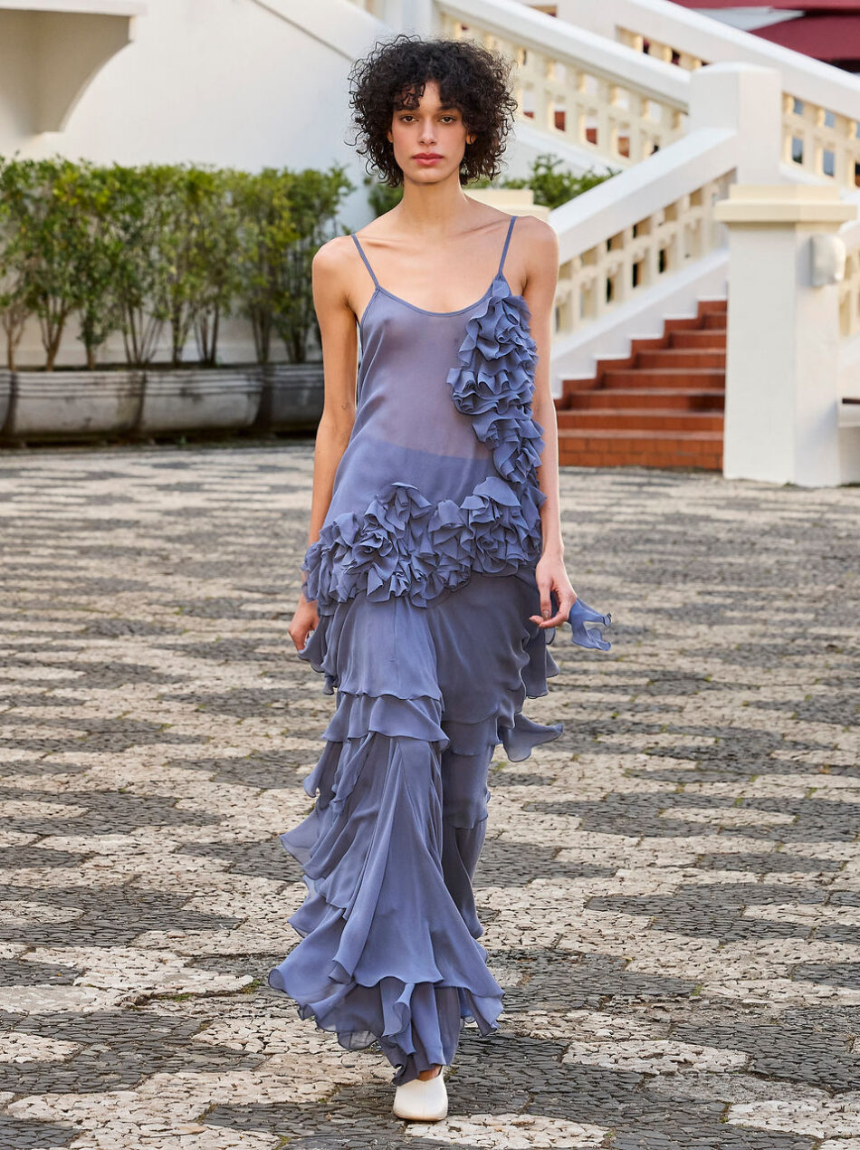 Em resumo, a história tem a ver com se apaixonar intensamente. Na conversa, Rafaella se autodescreve como alguém que não cabe em si. Característica que ela traduz nas roupas com volumes, formas, construções e detalhes que parecem extrapolar a razão. O interessante como isso tudo aparece: de forma delicada, como uma explosão contida e sensível.