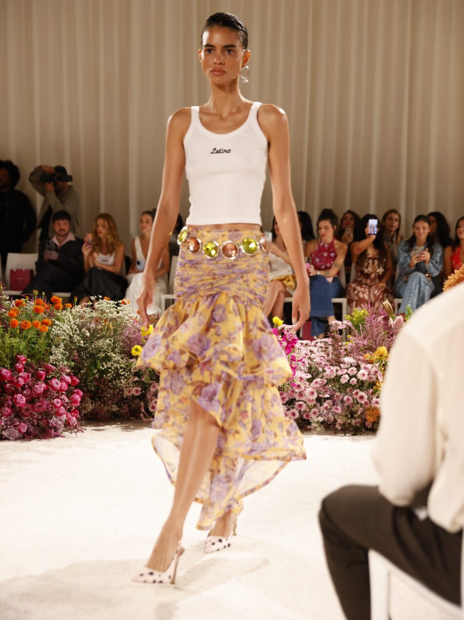 O primeiro look do verão 2026 da PatBO é composto de uma saia com estampa floral e babados e uma regata branca com a palavra latina estampada no peito. Faz quase cinco anos que a marca desfila em Nova York, mas essa foi a primeira vez que sua fundadora e diretora criativa, Patricia Bonaldi, falou explicitamente sobre latinidade.
