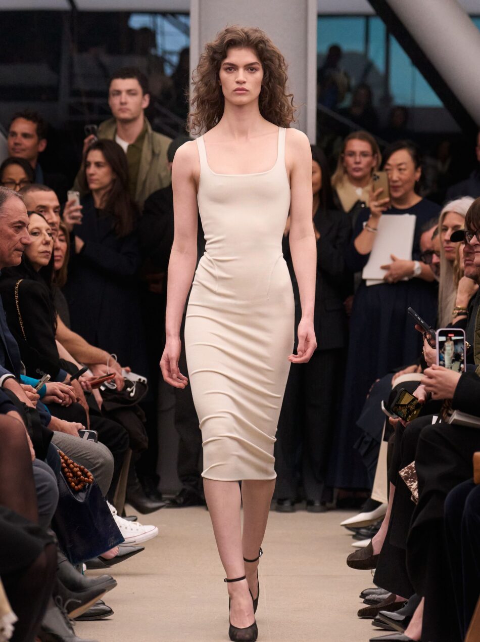 O primeiro look, uma regata tubular ajustada que termina abaixo do joelho, aparece em branco, cinza, preto, caramelo e vermelho. A peça faz referência a algo pop: o filme As Patricinhas de Beverly Hills (1995), mais precisamente quando a protagonista Cher Horowitz é assaltada usando um modelo semelhante e, ao receber a ordem de deitar no chão, dispara: ‘Não posso, isso é um Alaïa!’. A atriz Alicia Silverstone, que deu vida à personagem, estava presente na fila A.