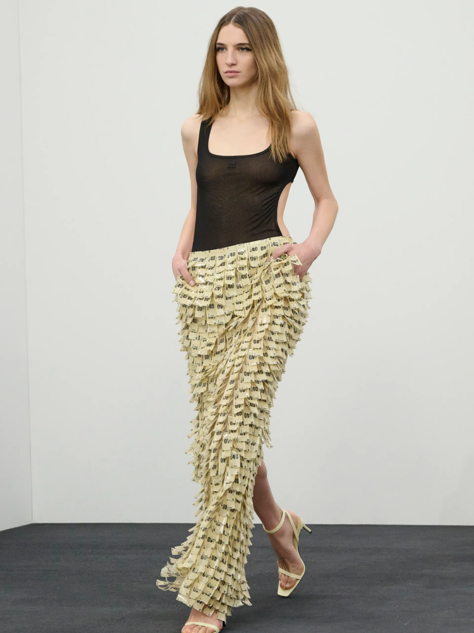 A ala de festa do desfile é onde estão as inspirações mais diretas aos arquivos da etiqueta. Nicolas recriou o top faixa do inverno 1974, deixando as costas inteiras de fora, a blusa transparente com dois quadrados cobrindo os seios do inverno 1968 e o vestido com decote geométrico do verão 1965, porém alongado. Há ainda visuais cobertos por reproduções de bilhetes de metrô e tíquetes da chapelaria do Courrèges Club, as festas organizadas pela label desde 2022.