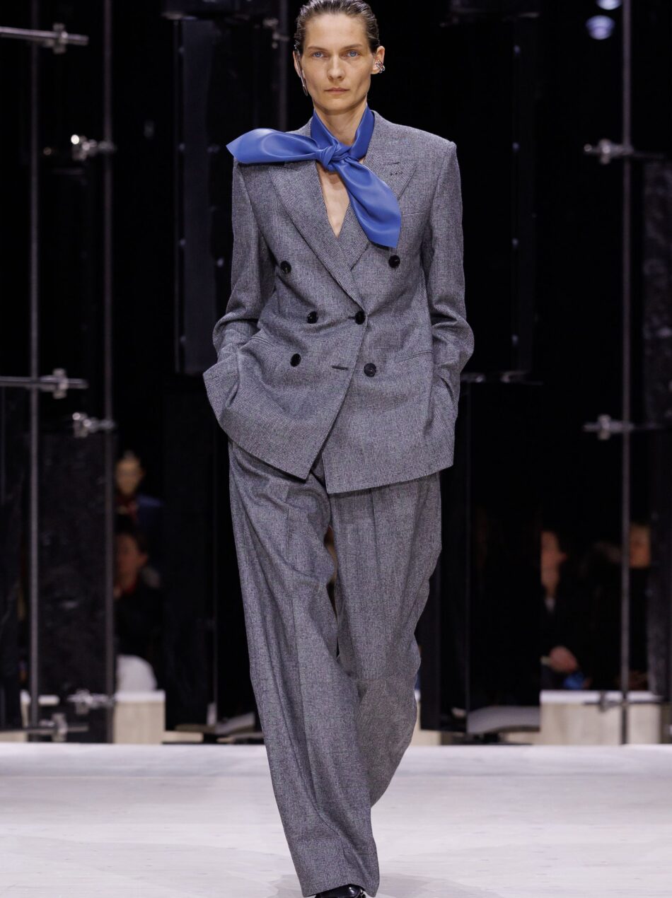 O seu interesse segue em explorar a força feminina através da desconstrução da alfaiataria. Ela dá mais uma vez um giro de 180 graus em alguns clássicos, como a camisa branca, que fica com as costas viradas para a frente. O colarinho é transformado em golas arquitetônicas sobre o busto. A escolha da designer pelo contrário tem a ver com uma percepção que ela teve ao mergulhar nos arquivos da grife: a parte de trás dos modelos sempre foi valorizada. Ainda explorando o tecido plano, costumes tradicionais aparecem com sapatos derby e gravata e variações de smokings ganham cinturas marcadas e são combinados com calças amplas.