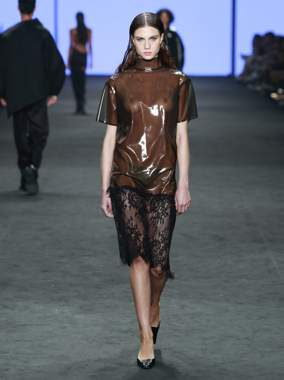 Por mais interessante que seja ouvir os caminhos percorridos pelo casal – suas pesquisas são sempre muito ricas –, é curioso notar como os melhores resultados são os que dispensam maiores explicações. Em outras palavras, são os que carregam a bagagem cultural com leveza e naturalidade. É o vestido-camiseta de látex verde com saia de renda preta, o longo com drapeados assimétricos usado por Daiane Conterato, as camisas brancas invertidas (com a frente nas costas), as saias com costura lateral para fora.