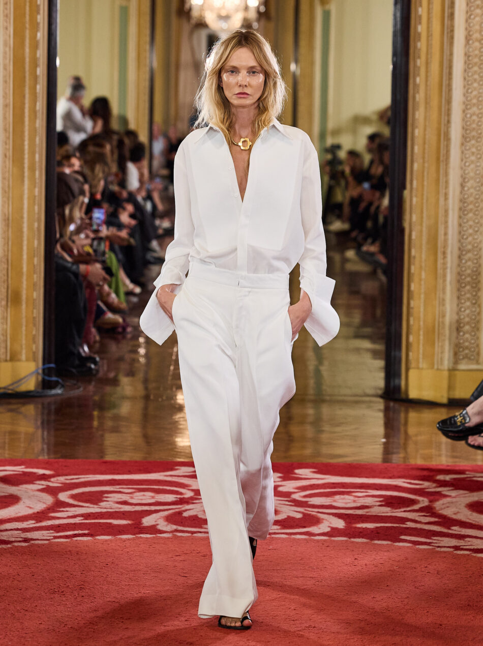 Podemos dizer que o primeiro look da Rio Fashion Week cumpriu o requisito. Era um conjunto de calça de alfaiataria e camisa de smoking com punhos exagerados e dobrados para cima, tudo branco, exceto a sandália rasteira preta. Quem vestiu foi Carol Trentini e a marca era Osklen.