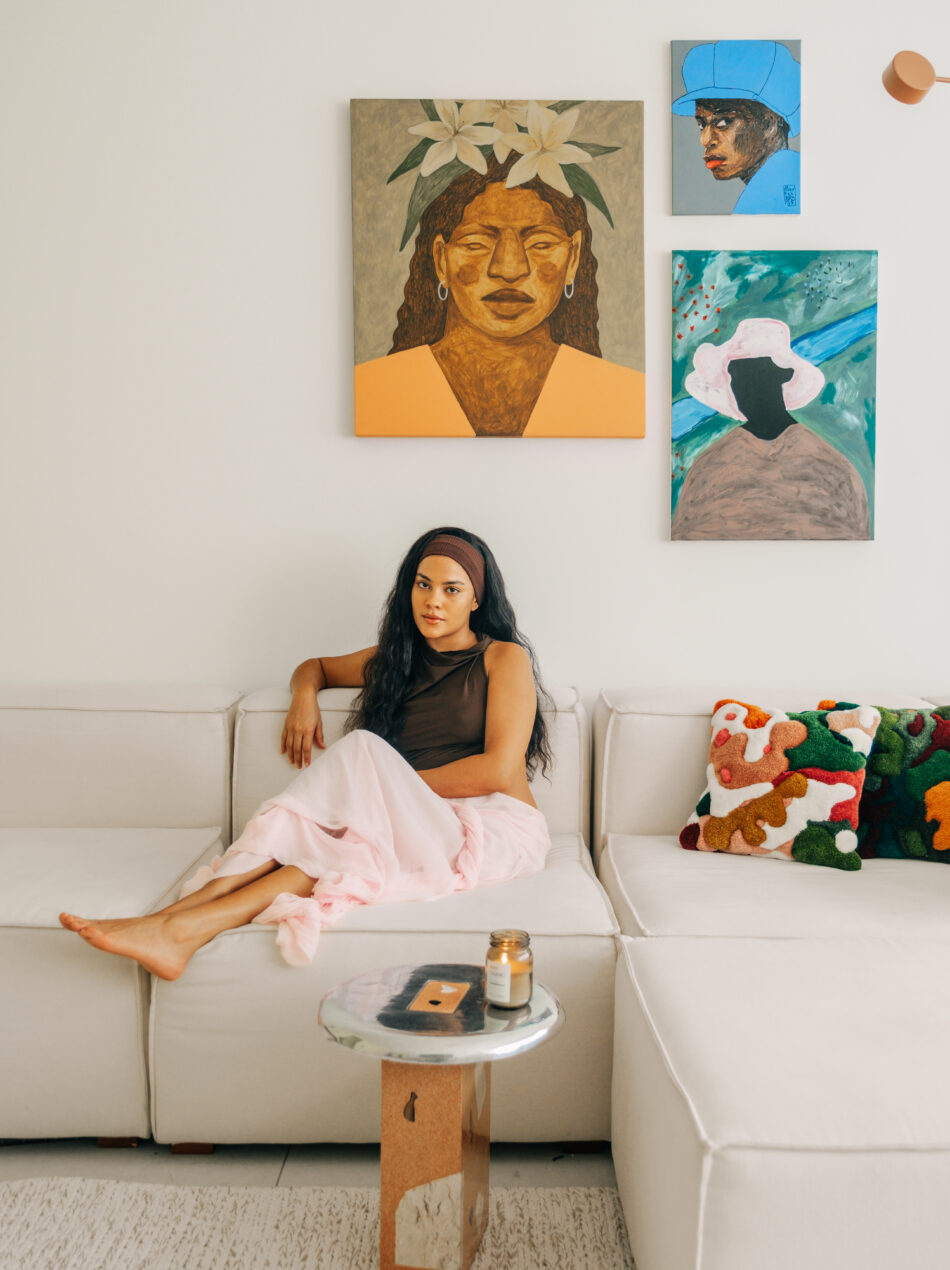 Próximo ao sofá, foi posicionada uma mesinha lateral do Assimply Studio, feita com materiais reaproveitados. “Fiz muita questão de trazer trabalhos de artistas negros. Acho super importante esse movimento colaborativo e de dar visibilidade, além de ter genuinamente me conectado com as obras”, disse a atriz.