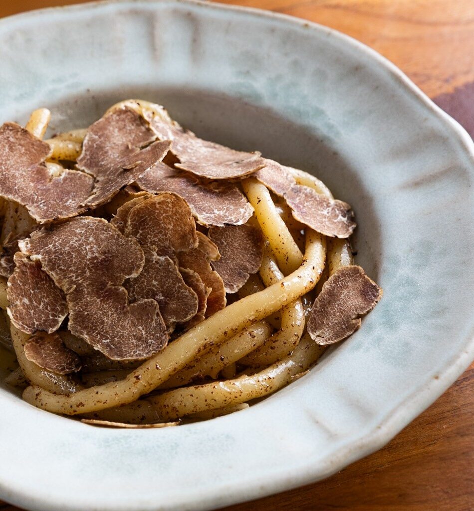 O menu de seis tempos terá pratos como a pizzetta (minipizza) pomodoro, com ovos de codorna e trufas negras, e o pici (massa que lembra espaguete mais grosso, com fios enrolados um a um) cacio e pepe, com manteiga noisette e trufas brancas.