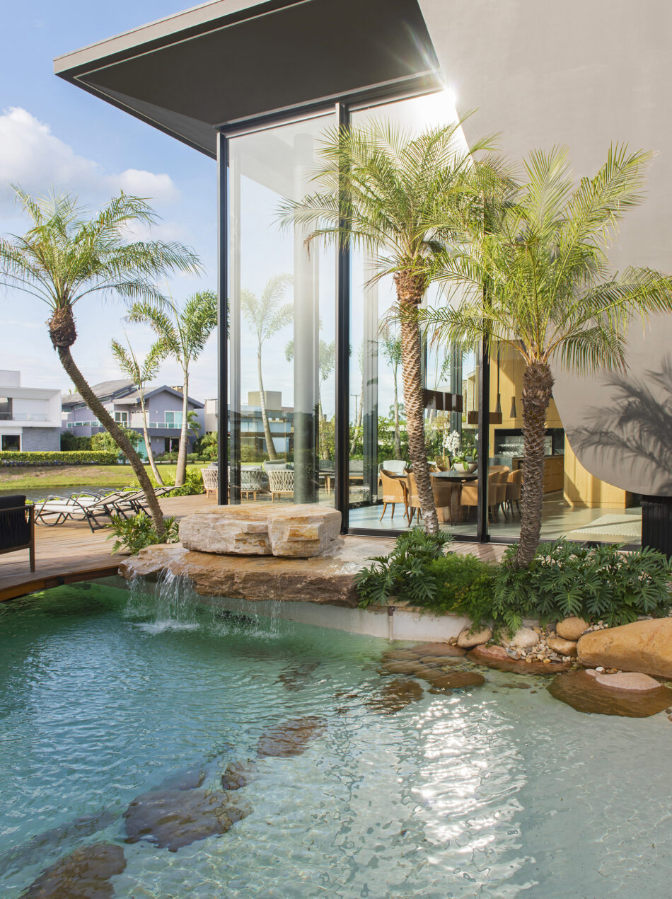 Neste projeto assinado pela Mayresse Arquitetura, a cascata para piscina assume uma estética totalmente orgânica. Utilizando rochas naturais, a água transborda de forma fragmentada, simulando uma nascente real. O contraste das pedras brutas com a transparência do vidro da fachada conecta o rústico e o contemporâneo, reforçado pelo paisagismo tropical da área externa.