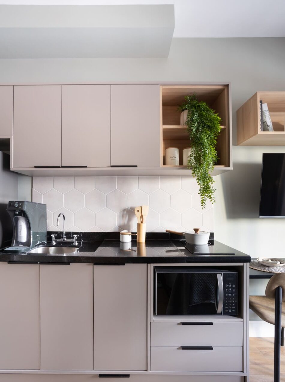 Em metragens reduzidas, o projeto precisa ser ainda mais estratégico. Algumas soluções têm se destacado nas cozinhas planejadas por otimizar o espaço sem comprometer a estética. “A calha úmida, que funciona como escorredor de louças, costuma ser posicionada atrás da torneira, mantendo a organização de forma discreta”, explica.