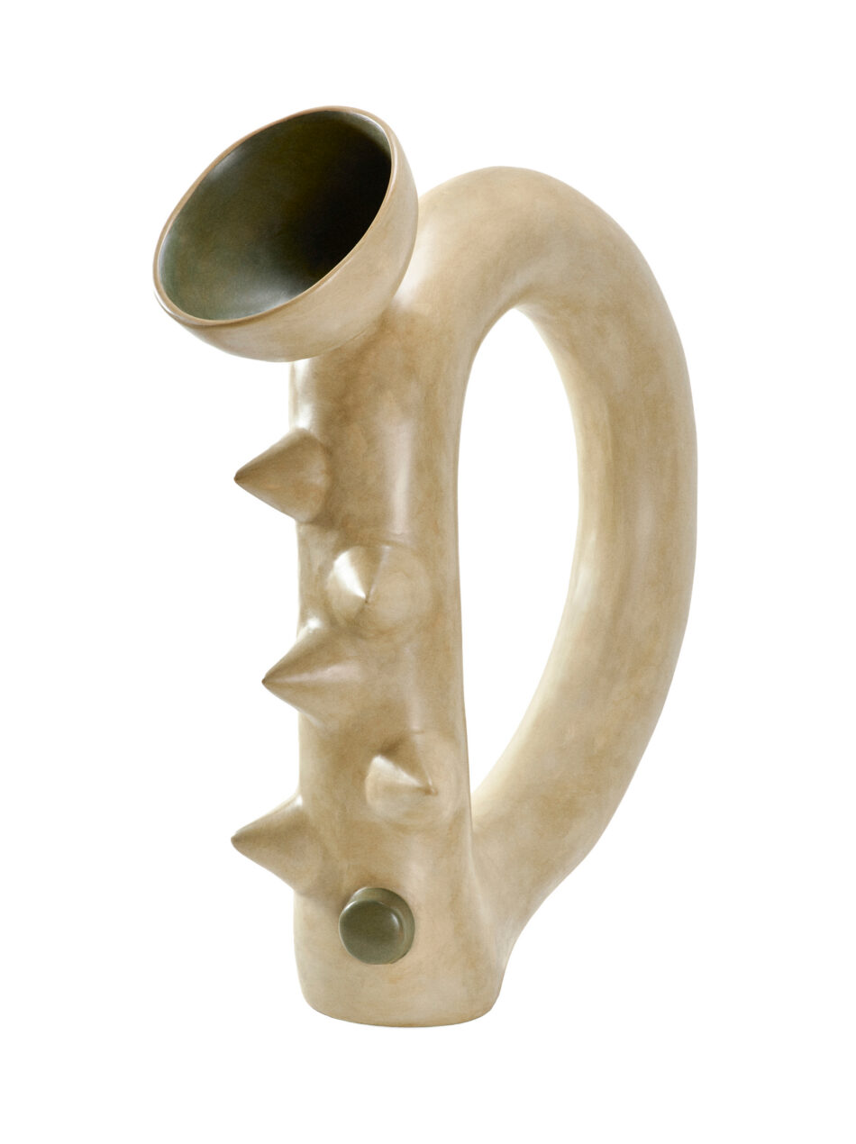 Para a sua participação, Vivi desenvolveu o vaso Ressonância. A peça escultural foi feita à mão com um material que seca à temperatura ambiente e não requer queima. Ela combina vidro reciclado triturado, algodão desfiado reaproveitado, adesivo, pigmentos e cimento.