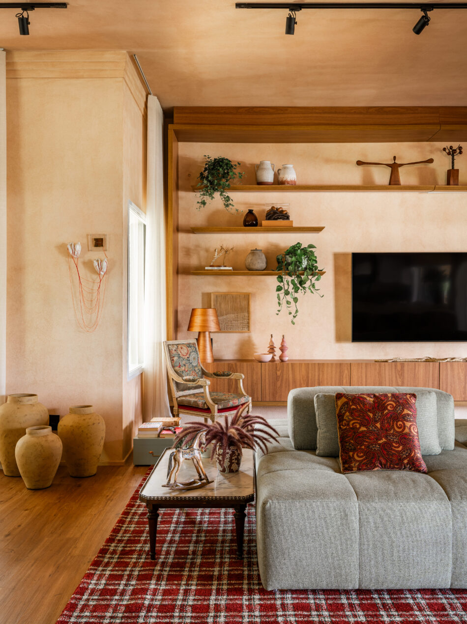 Projeto assinado pela designer de interiores Shirlei Proença conta com parede com técnica em limewash.