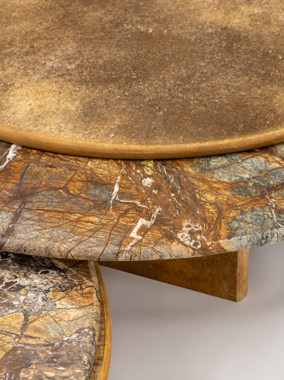 As peças são feitas, na verdade, de placas de plástico reciclado e fragmentos de pedras naturais, provenientes de sobras e descartes de chapas. Ao todo, In.verso reúne 15 itens, entre mesas de centro, mesas laterais, mesa de jogos, espelhos e arandelas.