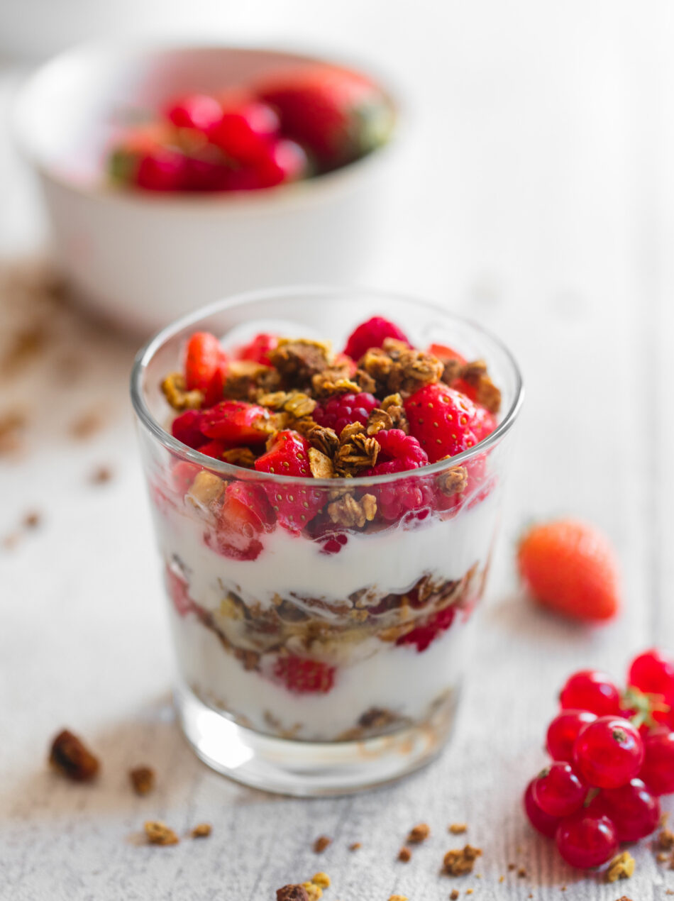 Receita de parfait proteico de de iogurte com frutas vermelhas