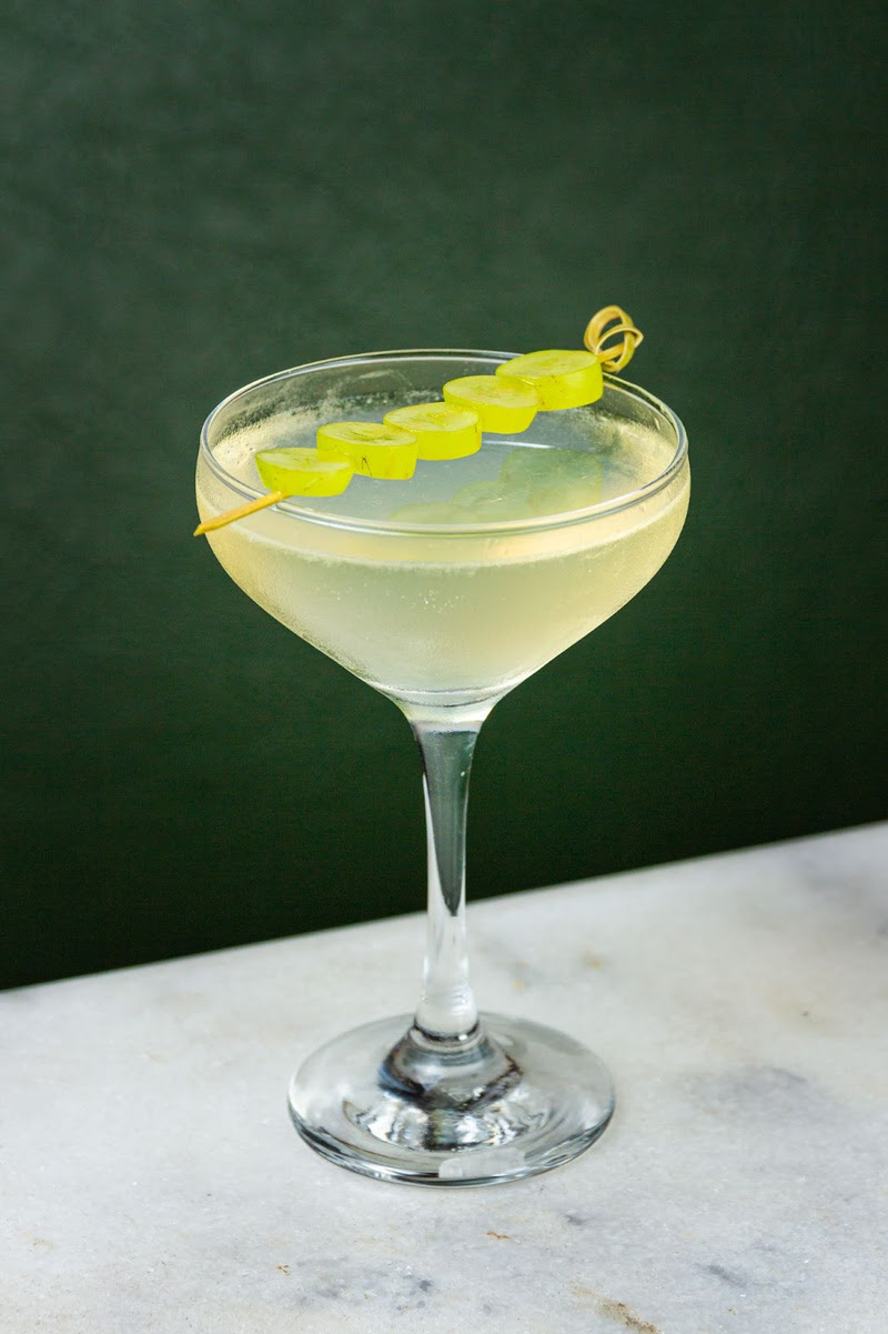Em uma taça coupe, adicione a mistura e complete com o espumante. Coloque as uvas em um palito e apoie horizontalmente sobre a borda do copo para decorar.