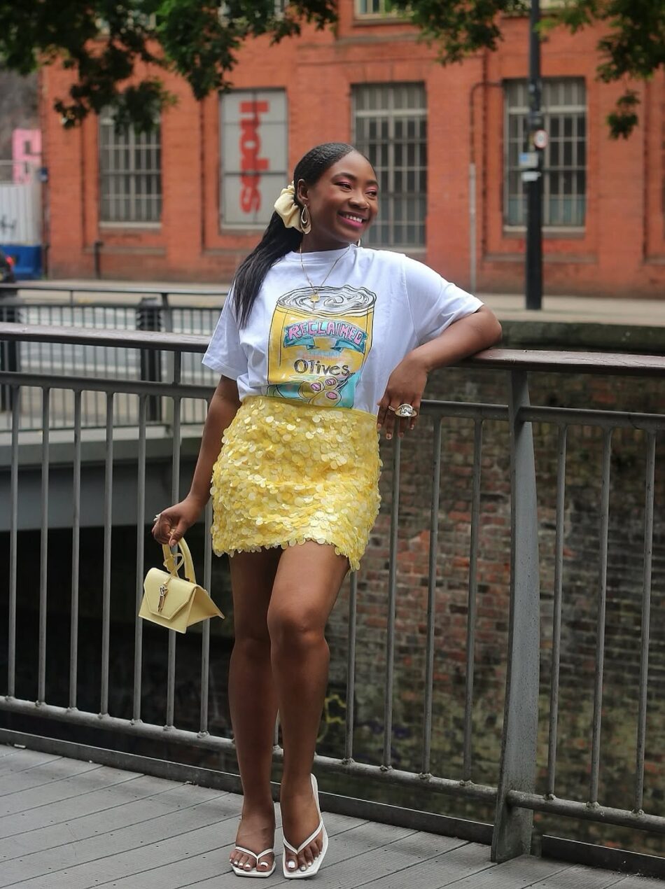 Nas ruas, o metalizado aparece tanto em superfícies espelhadas quanto em aplicações tridimensionais e paetês mais suaves. Essa variedade de acabamentos amplia as possibilidades: há a versão dramática para eventos noturnos e a leitura mais casual para o dia a dia. A saia dourada acompanha todo o espectro fashionista, do impacto visual ao brilho discreto.
