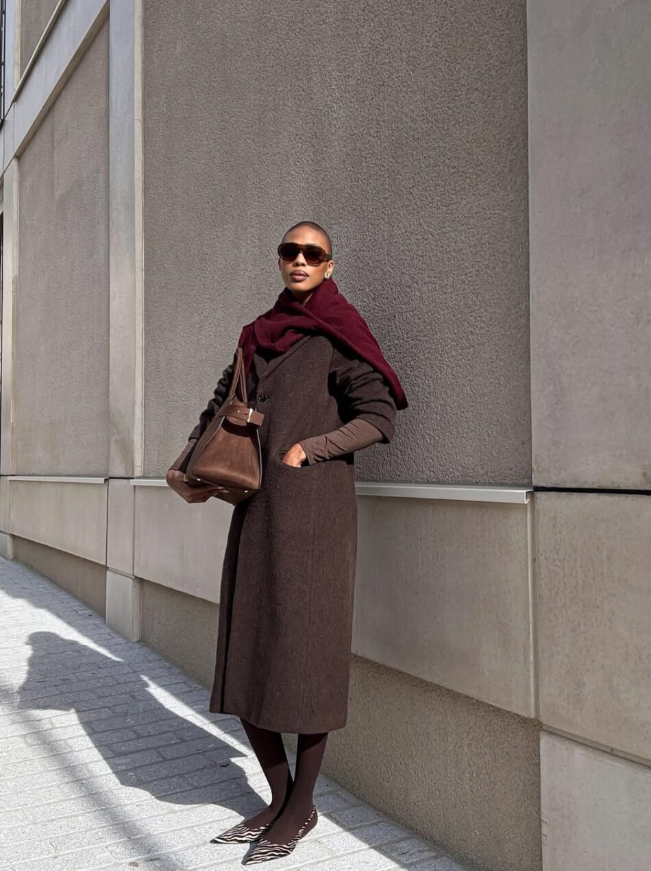 Nos dias frios, o marrom revela toda a sua intensidade. Em versões escuras e profundas, a cor ganha imponência quando combinada a casacos pesados, sobreposições e texturas luxuosas. O efeito é um visual de impacto, sofisticado e ao mesmo tempo acolhedor, que confirma a versatilidade dos tons de marrom ao longo das estações.