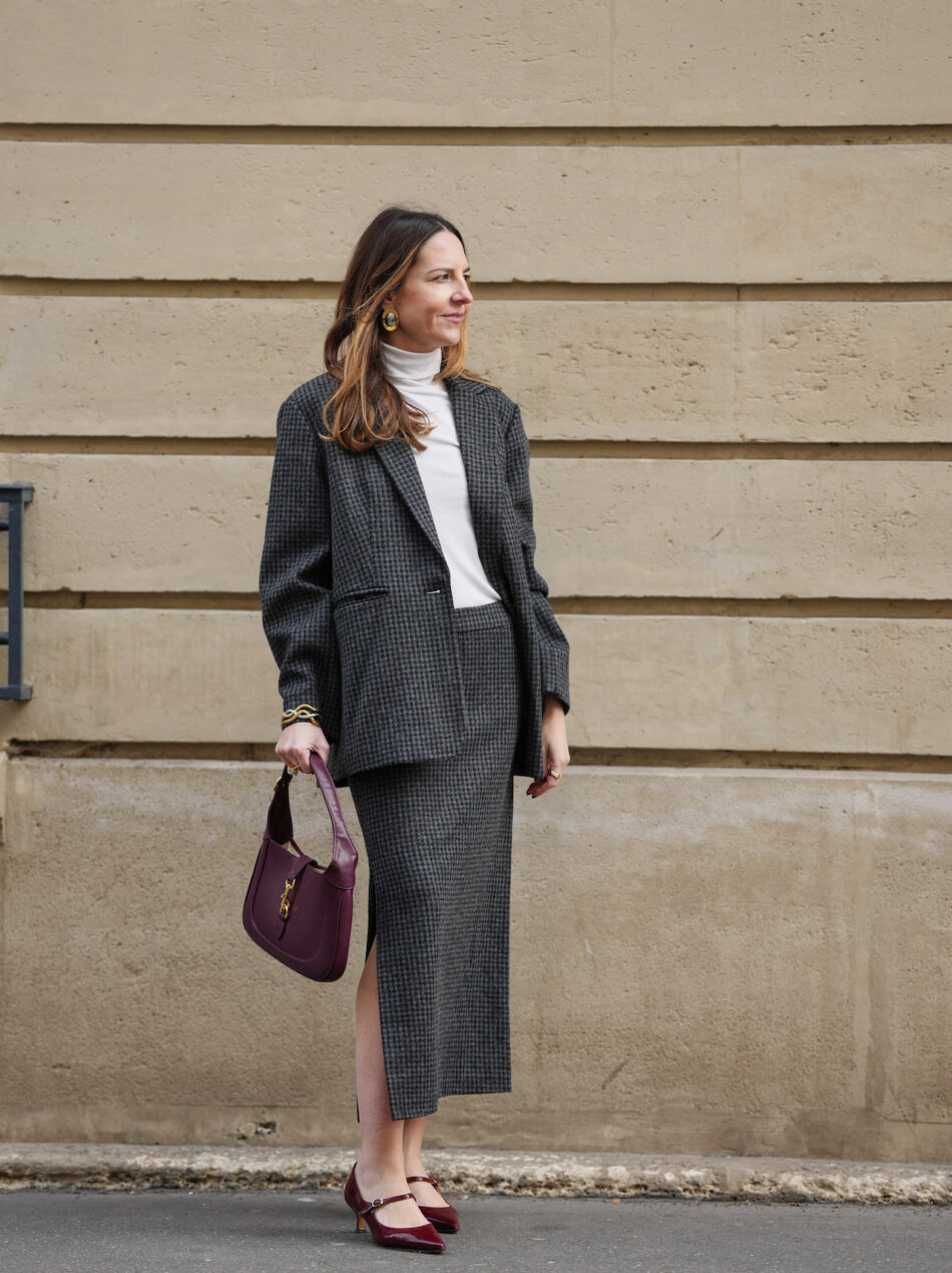 Um vestido de corte simples ou uma saia midi já resolvem grande parte do look de trabalho. O sapato fechado com salto bloco médio entra para completar o visual, mantendo a leitura formal e equilibrando comprimentos mais longos. Em produções enxutas, ele não interfere no styling.