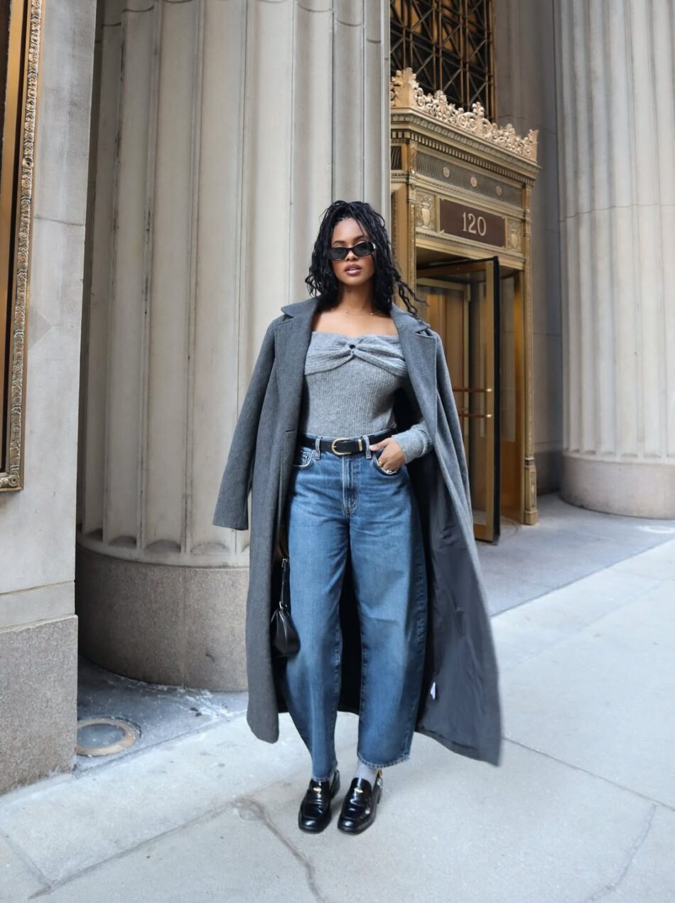Nas ruas, a ideia não é muito diferente, mas ganha um ajuste mais prático. O shape amplo deixa de ser protagonista isolado e passa a ser equilibrado por peças mais secas, como polos, blusas caneladas e casaquetos. Esse jogo de proporções ajuda tirar as calças baggy do território casual e abre espaço para um dress code mais polido.
