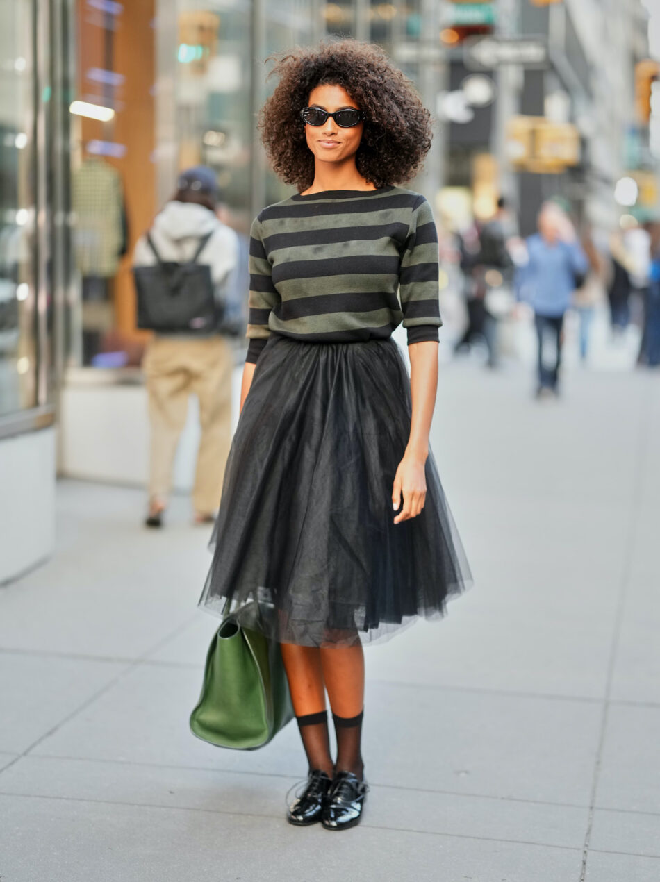 Outro caminho interessante é o mix de texturas. Pense em saias de tule ou tecidos sofisticados combinados a meias coloridas ou metalizadas. Esse contraste inesperado funciona como ponto de energia em produções mais sóbrias, além de reforçar a ideia de que os acessórios são capazes de mudar completamente a leitura de uma roupa.