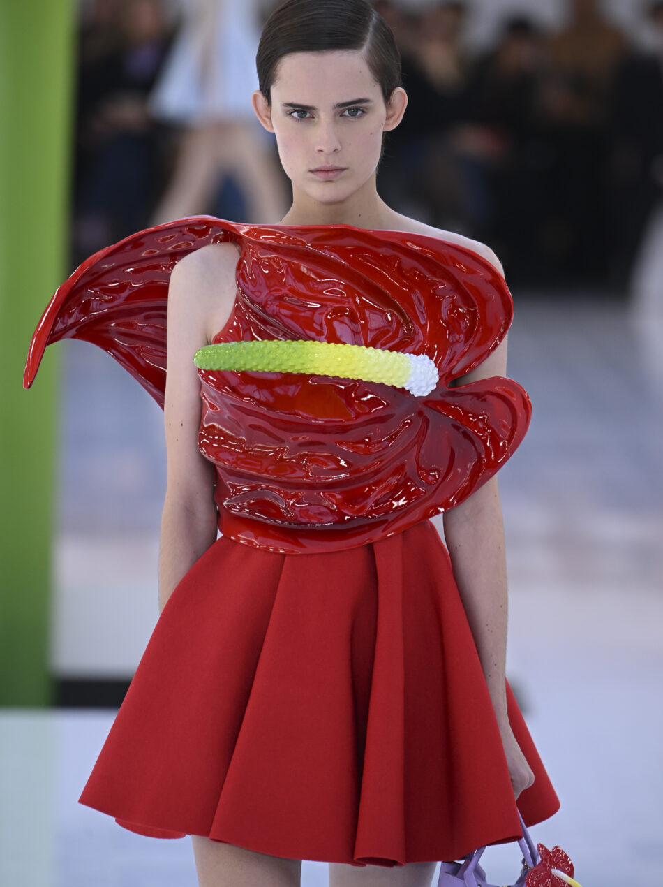 Após a pandemia, Jonathan Anderson desperta ainda mais o seu interesse pela era da pós-verdade. A realidade, afinal, passa a ser manipulada digitalmente, agora até por inteligência artificial. Ele puxa então o conceito do surrealismo para a vida conectada. Um antúrio gigante feito de fibra de vidro faz parte do cenário e, na roupa, a flor enfeita a parte de cima dos vestidos. Sapatos com a aparência inflada lembram os da personagem Minnie Mouse, da Disney, e um conjunto de moletom, que parece feito de píxels, confunde os olhos, brincando com o fato de que nem tudo é o que parece.