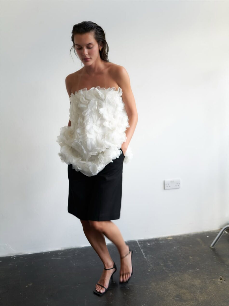 O combo de top com textura e volume com a saia-lápis preta funciona exatamente assim: a saia traz sobriedade, enquanto a parte de cima assume o protagonismo. O resultado é um look estruturado, elegante e ideal para quem quer fugir da previsibilidade do vestido sem abrir mão da feminilidade.