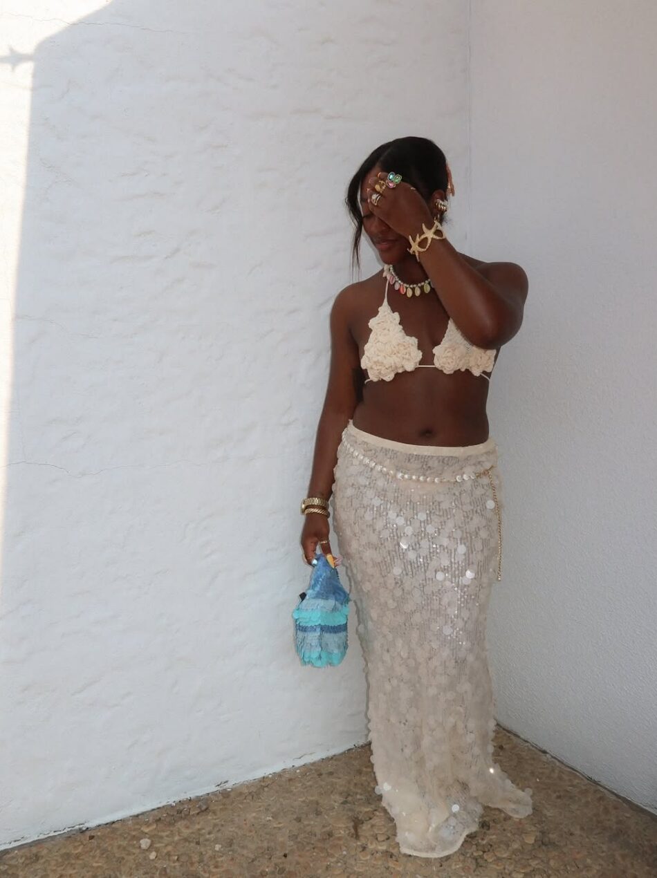 O contraste entre o casual do biquíni e o glamour do paetê transforma essa combinação em uma das mais ousadas da temporada. É a proposta perfeita para quem quer entrar no clima de celebração sem abandonar o mood tropical.