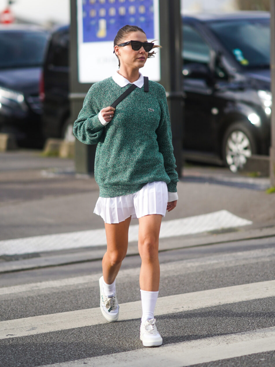 Com suéter e tênis, a minissaia plissada ganha uma leitura esportiva e atual. A combinação remete ao universo preppy, mas oferece uma abordagem um tanto mais relaxada e urbana. O combo perfeito para quem também busca conforto!