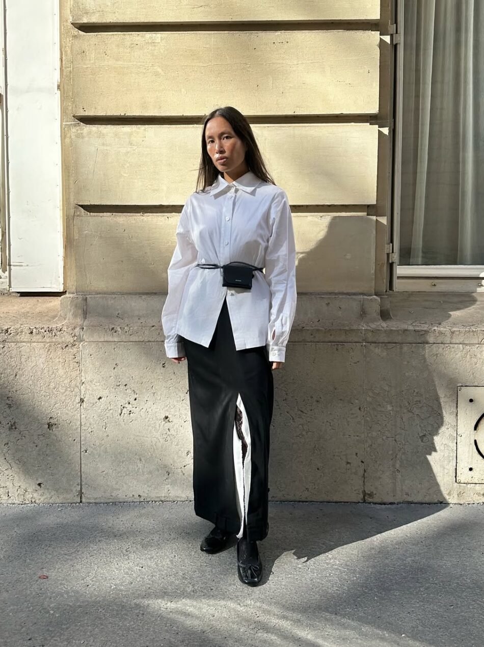 Dê uma folga para a calça e tente trazer para a equação uma saia longa de alfaiataria. A substituição traz um frescor às composições sociais, que se atualizam ainda mais com acessórios pontuais. Aqui, a bolsa de cintura traz uma leitura utilitária e atual, além de definir levemente a silhueta do visual, que até então era mais reta.