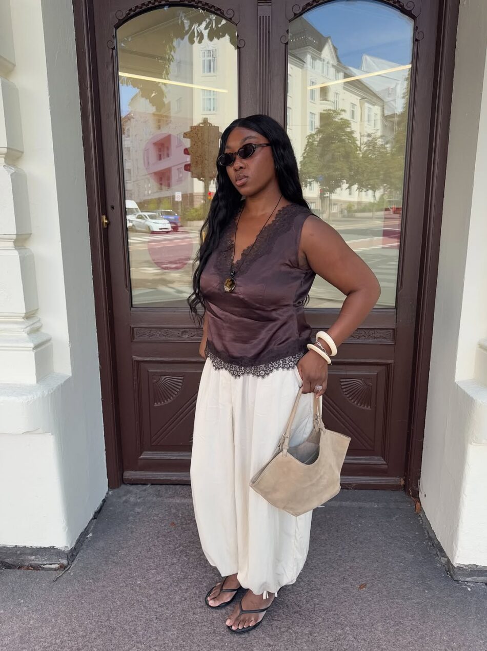 A calça Aladim traz movimento e fluidez, enquanto a regata acetinada com detalhe em renda adiciona delicadeza e sofisticação. O chinelo entra como elemento de equilíbrio, deixando o look elegante sem parecer formal demais.