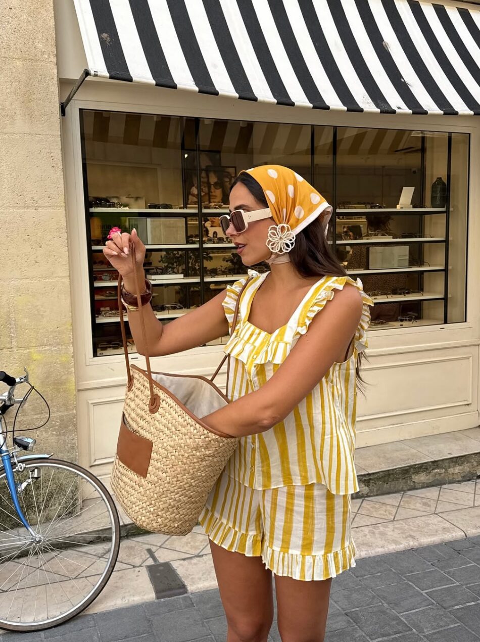 Os looks com lenço na cabeça podem ser muito intencionais. E o visual acima é uma prova disso. Ao lado do conjuntinho listrado, o acessório cria um mix de estampas que deixa a coordenação cromática de branco e amarelo muito mais interessante.
