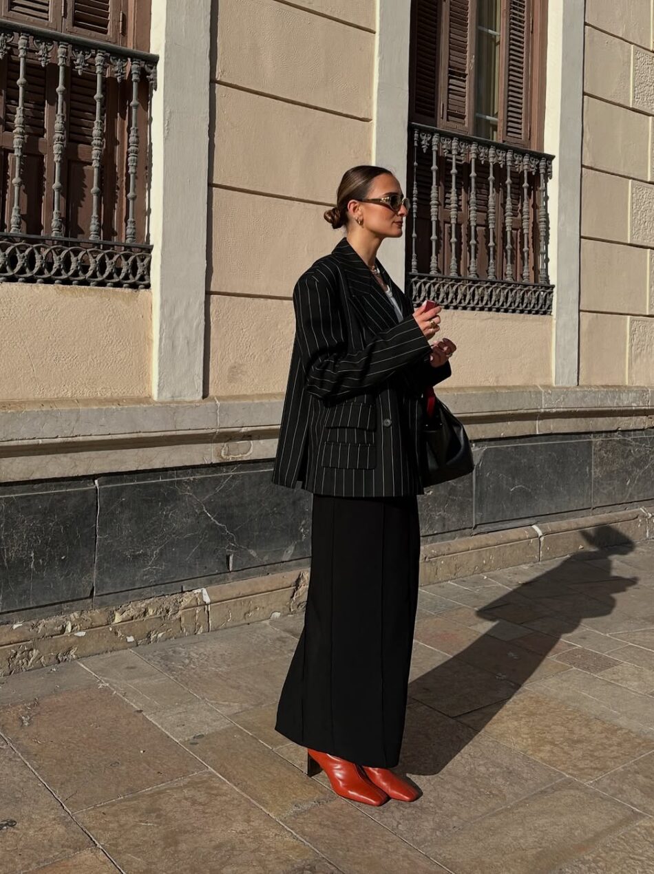 A saia longa encontra sua melhor versão quando recebe uma bota colorida – especialmente vermelha, que adiciona energia e modernidade ao visual. É uma combinação inesperada, mas incrivelmente elegante, ideal para dias em que você quer sair do óbvio.