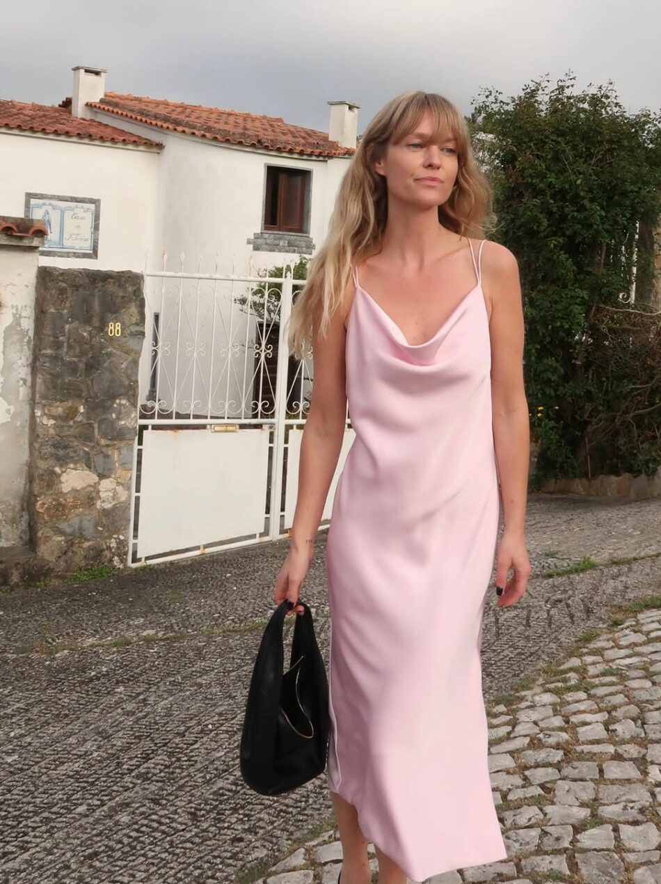 O vestido acetinado é uma escolha certeira para quem quer elegância instantânea. O tecido fluido e brilhante traz glamour sutil, enquanto o corte mídi mantém o equilíbrio entre o sofisticado e o minimalista.