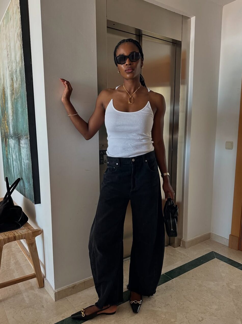 Com uma regata, a calça balloon e ótimos acessórios, é possível criar um visual estiloso em questão de minutos. Aqui, o sapato slingback com correntes no topo, o colar com pingente maximalista e os óculos escuros poderosos injetaram modernidade e elegância à equação.