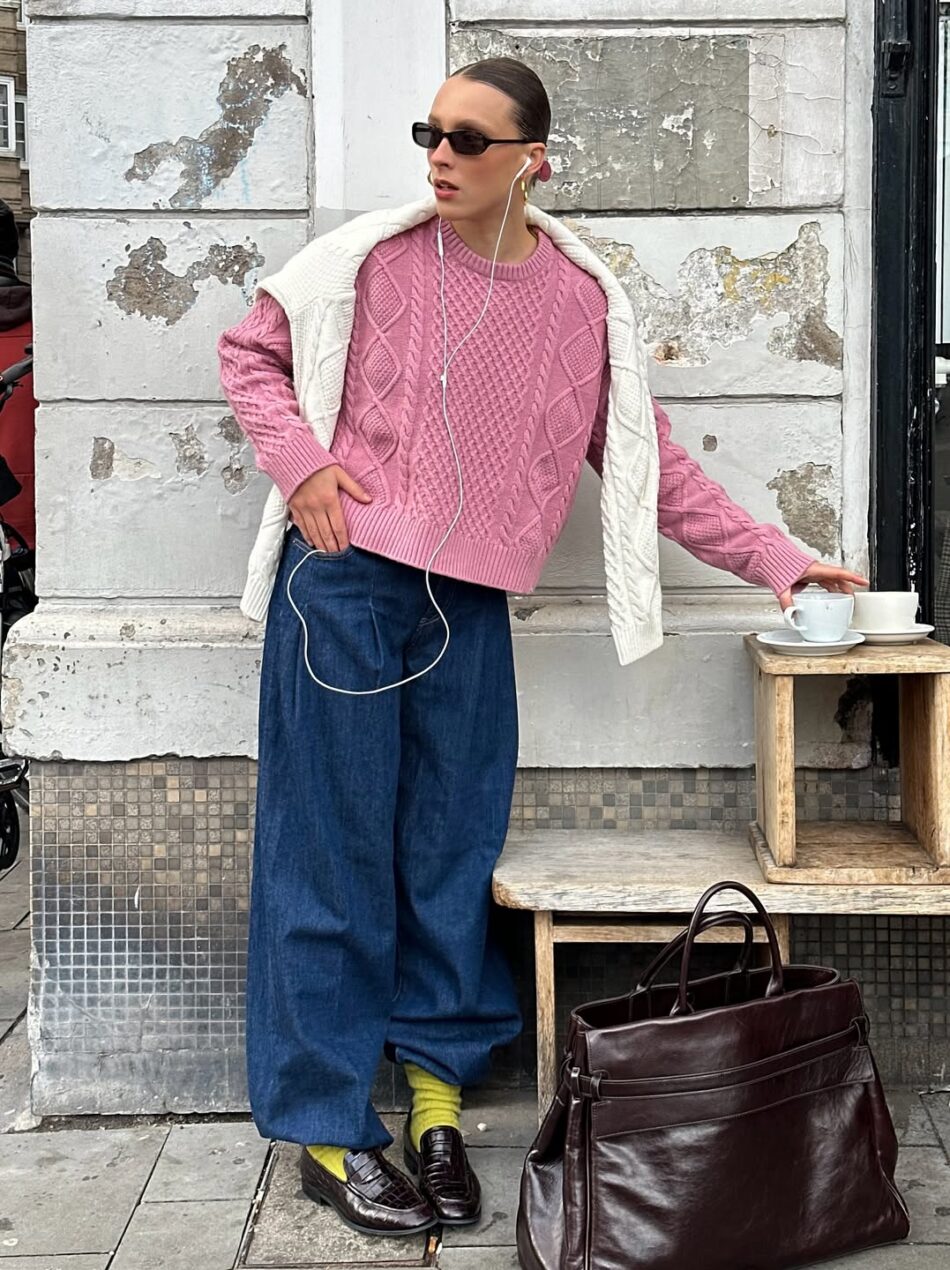 Amarrar o suéter na cintura é um truque simples, mas eficiente. Além de funcional, ele quebra a linha vertical da calça e adiciona uma camada que deixa o look mais dinâmico.
