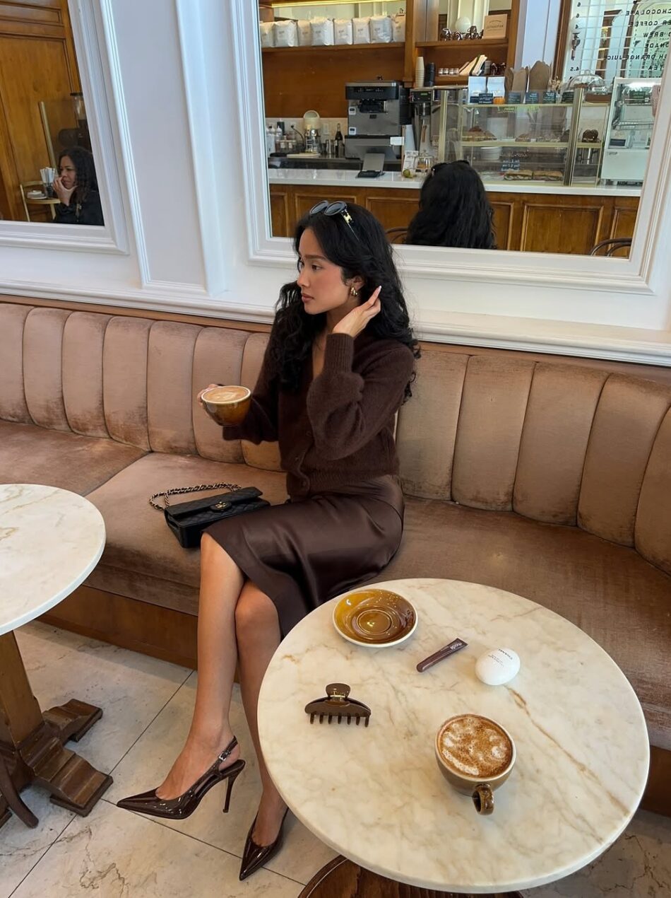 Dupla dinâmica: um combo que faz sucesso entre as fashionistas é o de marrom intenso com um tom suave e quase pastel de azul. Vale investir na dupla para modernizar produções com peças de alfaiataria, como o look acima, com camisa, colete e blazer oversized. A mistura de referências clássicas com detalhes modernos, tipo a saia mídi de cetim e as meias coloridas, torna o visual superinteressante.