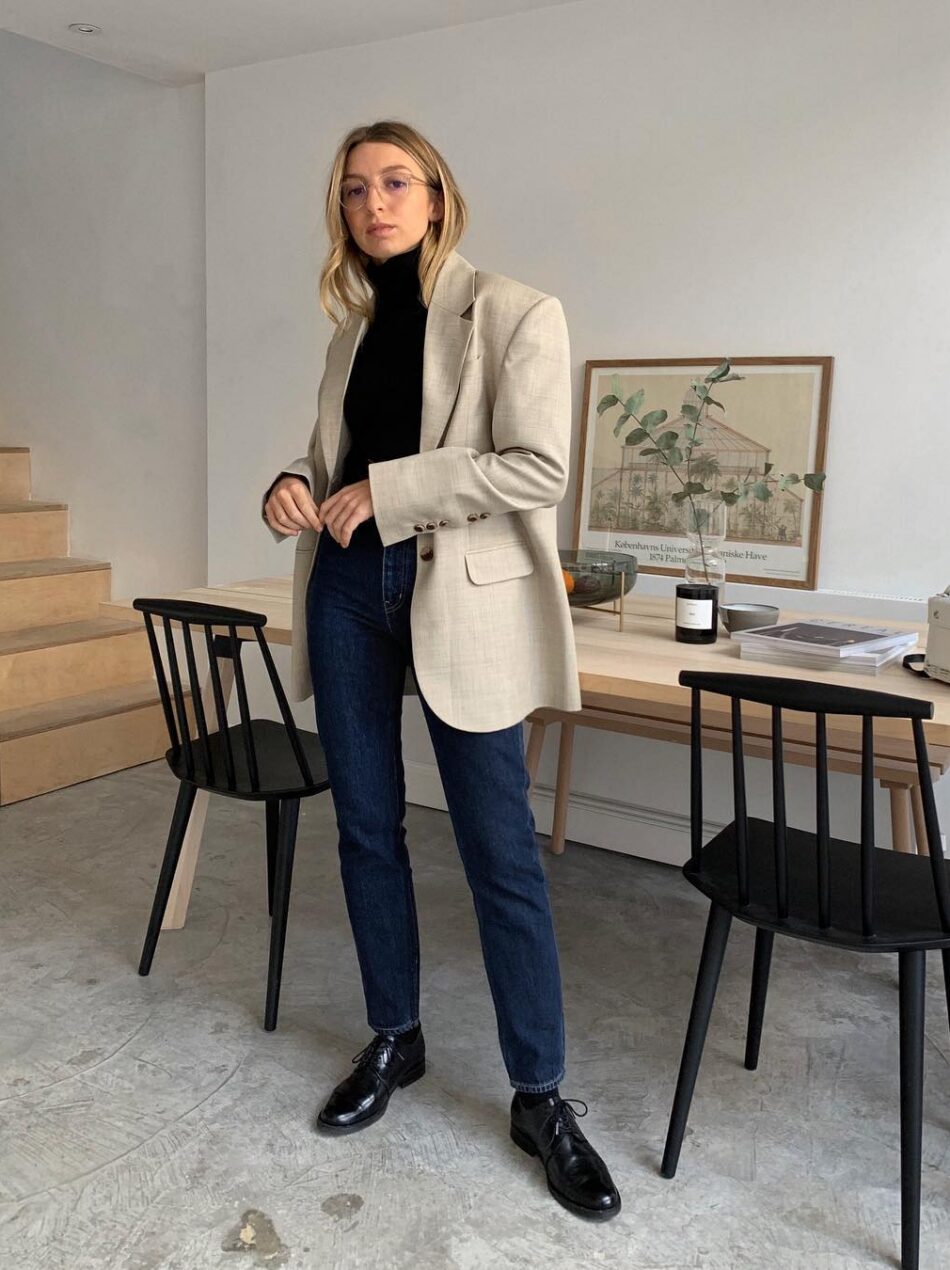Combinar a calça skinny com peças amplas, como um blazer oversized, é um truque simples para atualizar o visual. O mix cria um jogo de proporções que deixa o visual muito interessante e estiloso.