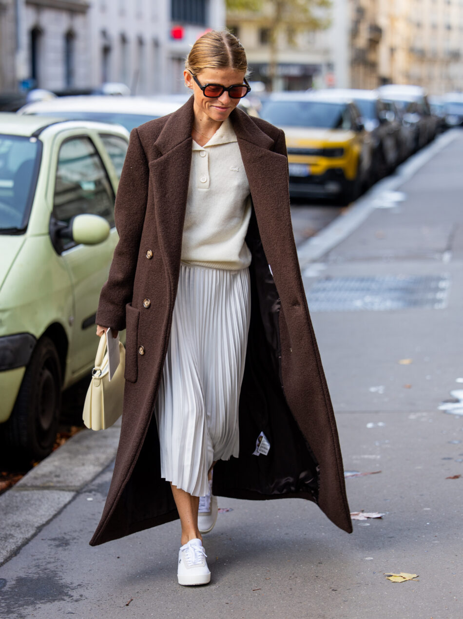 Para garantir conforto máximo nos dias frios, introduza um casacão longo e pesado aos looks com a saia plissada. Uma camisa polo traz o mood esportivo para a equação, efeito que pode ser turbinado com a presença de tênis brancos nos pés. Que tal?