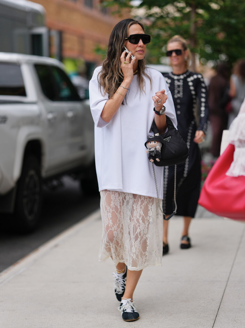 O hi-lo na medida: camiseta oversized desconstruindo a sensualidade da saia de renda transparente. Um styling fácil de reproduzir, que traz o toque urbano para a tendência.