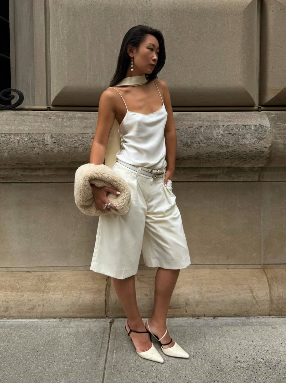 Mas nem só de blazer e calça se faz a alfaiataria. Introduza um frescor aos looks para confraternização da empresa com as bermudas – a peça promete ser um foco do verão! Para deixar a produção ainda mais descontraída, considere uma blusa acetinada e uma clutch impactante para finalizar o visual!