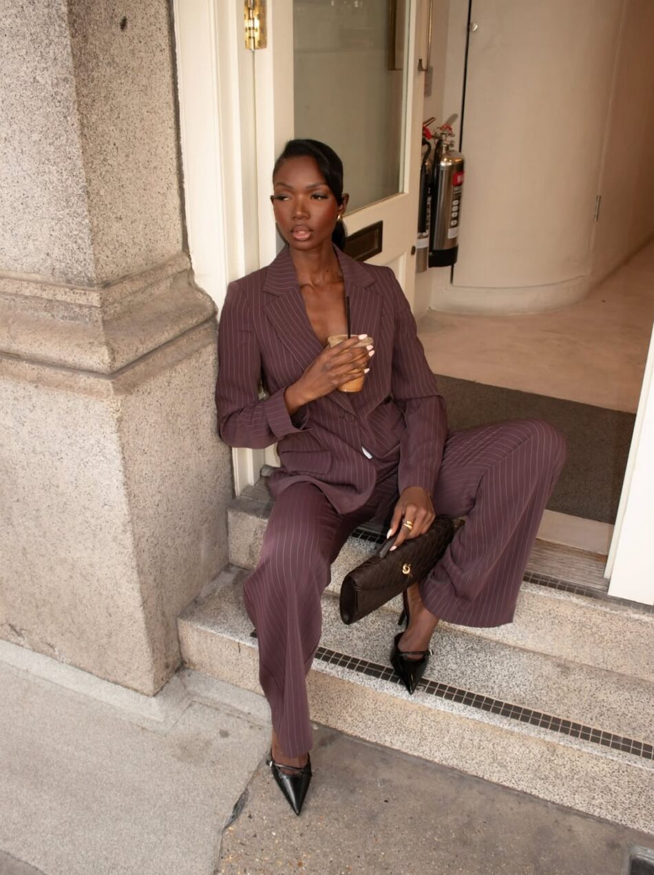 Queridinho de 2025 – inclusive nomeado como a cor do ano passado pela Pantone –, o marrom segue inabalável e surge como uma aposta sofisticada para adicionar nuance à calça de alfaiataria feminina sem fugir das cores neutras. Em versão risca de giz, ele acrescenta ainda mais elegância à peça.