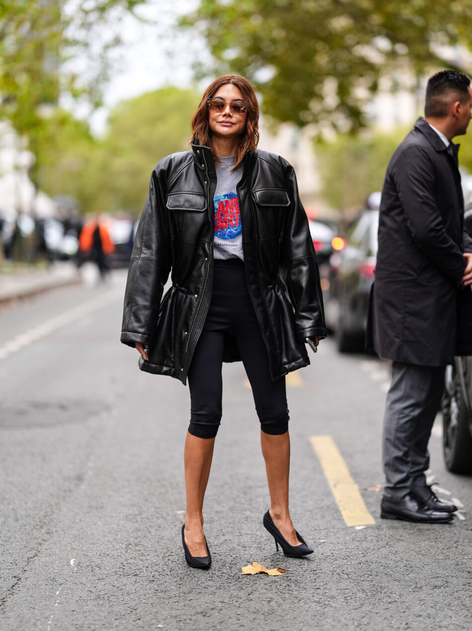 Misturar peças básicas com elementos de impacto é a chave. A legging capri com t-shirt e jaqueta de couro ganha sofisticação com escarpins, criando um contraste interessante entre conforto e informação de moda.